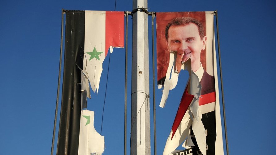 A billboard bearing a picture of Syria's President Bashar al-Assad and a national flag are torn by anti-government fighters in the northern city of Aleppo on November 30, 2024. Jihadists and their Turkish-backed allies breached Syria's second city of Aleppo on November 29, as they pressed a lightning offensive against forces of the Iranian- and Russian-backed government. (Photo by Omar HAJ KADOUR / AFP)