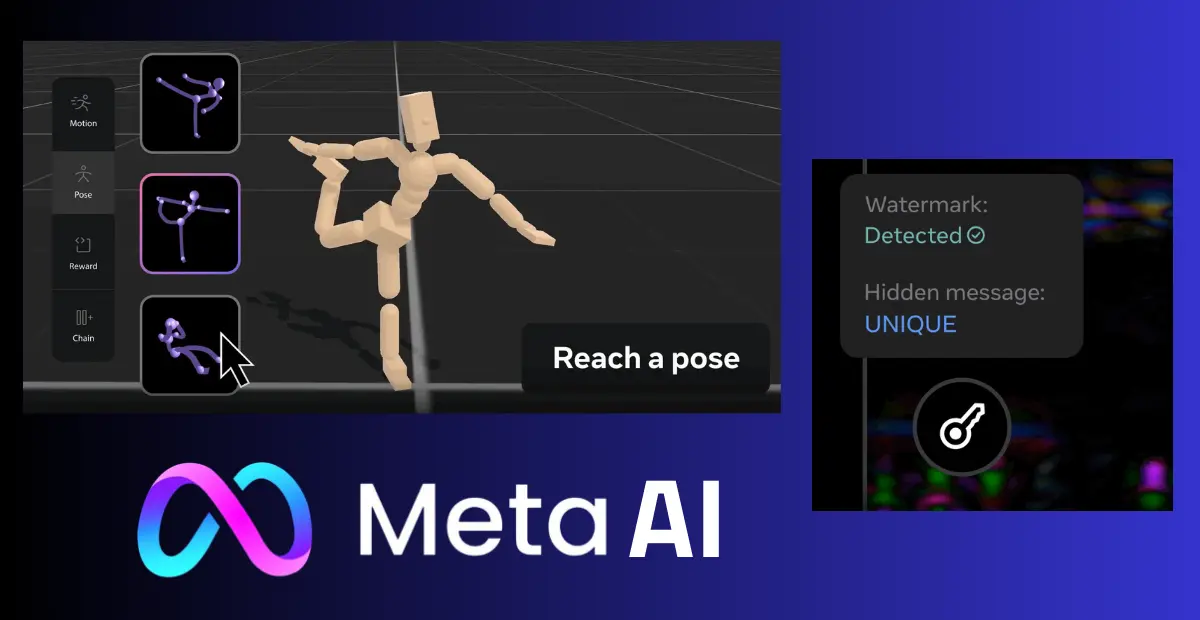 صورة توضح استخدام أدوات الذكاء الاصطناعي من ميتا مثل "Meta Motivo" و"Meta Video Seal" لتحسين الألعاب وحماية المحتوى الرقمي.