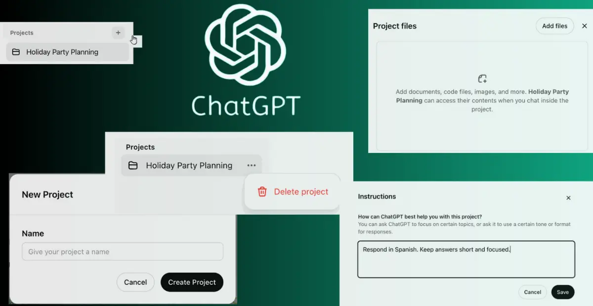 ابتداءً من اليوم، ستقوم OpenAI بإتاحة هذه الميزة تدريجيًا لجميع المستخدمين، وقد يتعين على البعض الانتظار قليلاً لتجربة هذه الأداة. خلال العرض التجريبي للميزة، استعرضت OpenAI عدة طرق لاستخدام ميزة “المشاريع”، منها: