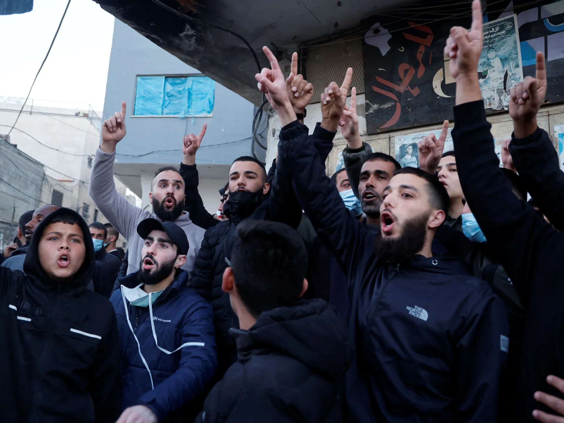 فلسطينيون يطالبون بإنهاء الاشتباكات بين قوات الأمن الفلسطينية ومقاومين في جنين (رويترز)