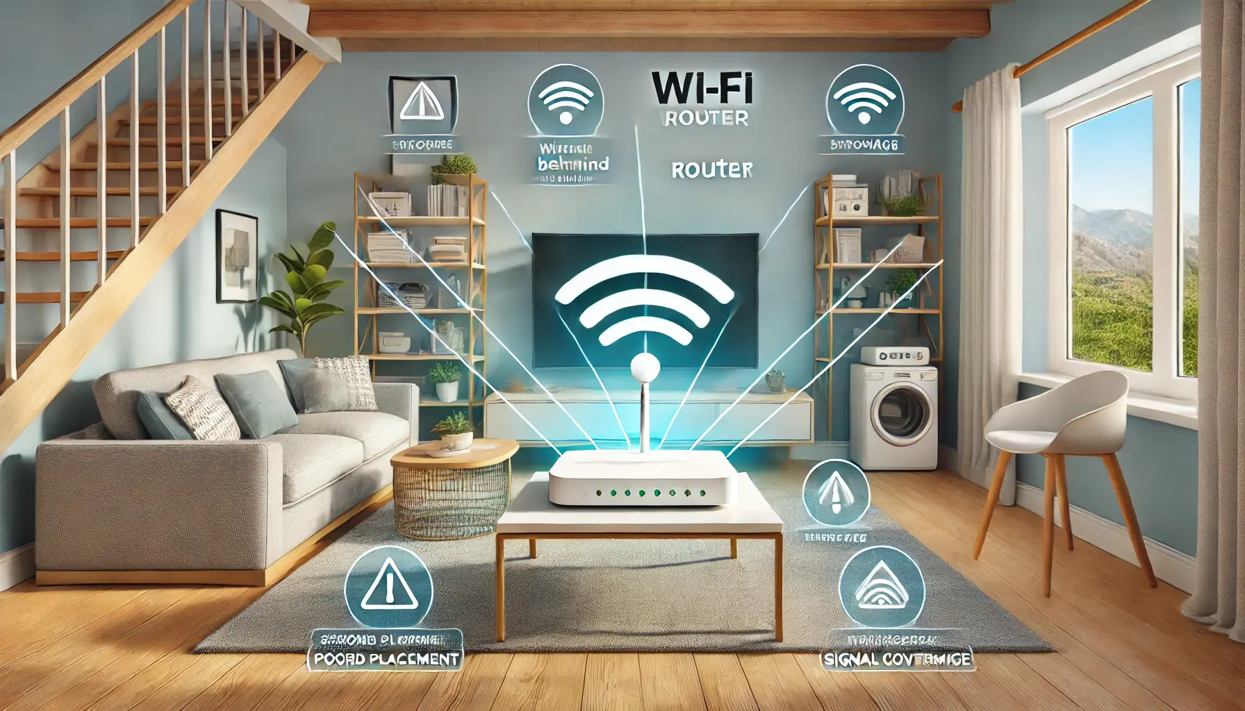 صورة توضح كيفية وضع جهاز الراوتر في مكان مركزي بالمنزل، مع نصائح لتحسين سرعة الانترنت.