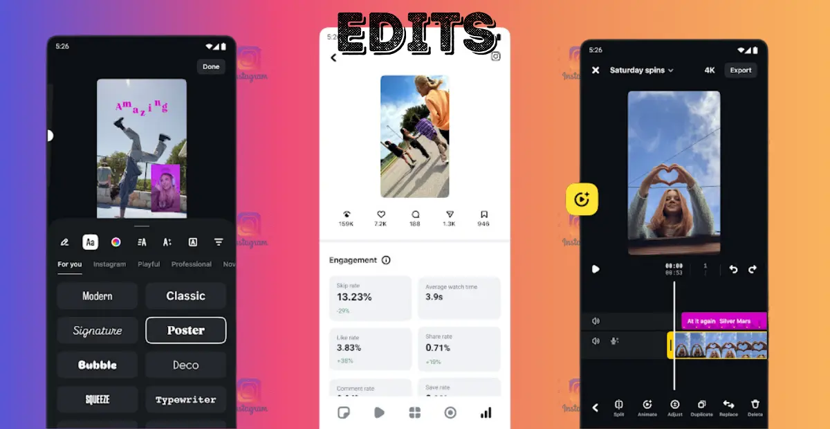 يأتي تطبيق Edits بمجموعة من الأدوات الذكية التي تجعله مناسبًا للمبدعين ومنتجي المحتوى على المنصات الاجتماعية: