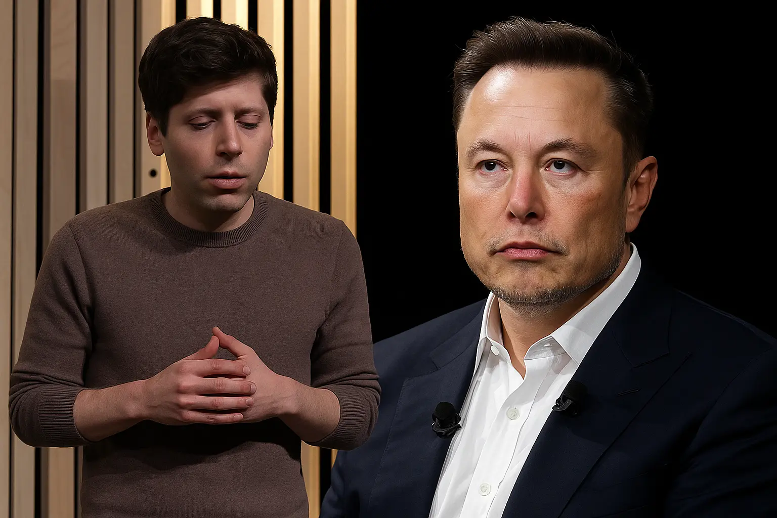صورة توضيحية لسام ألتمان وإيلون ماسك أمام خلفية رقمية تمثل الذكاء الاصطناعي والعملات الرقمية