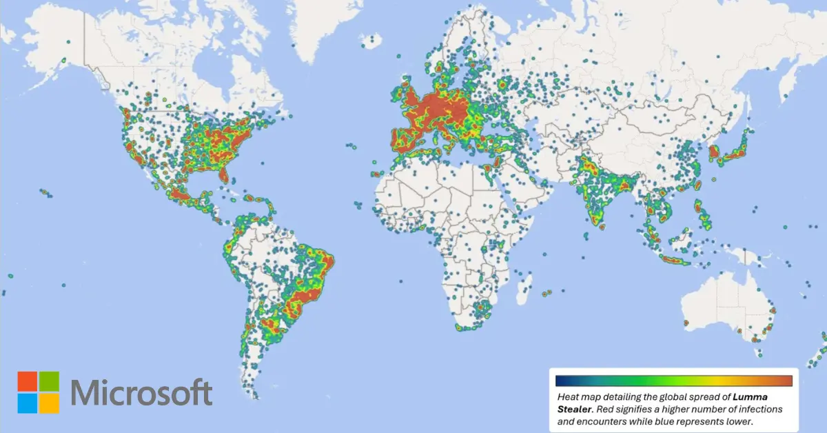 خريطة تُظهر انتشار برمجية Lumma على أجهزة ويندوز حول العالم مع شعار مايكروسوفت وجهود التصدي للهجمات الإلكترونية