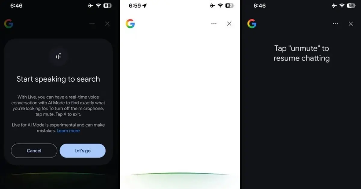 تُوفر واجهة Search Live تجربة استخدام مبسطة وسهلة التفاعل. في البداية، يمكن للمستخدم الاختيار بين شاشة داكنة أو فاتحة حسب إعدادات الجهاز. كما يظهر في أسفل الشاشة زران واضحان، أحدهما لتفعيل الصوت تحت اسم “Unmute”، والآخر لعرض النص المرافق للمحادثة تحت اسم “Transcript”. بالإضافة إلى ذلك، تسمح الواجهة بإيقاف الميكروفون مؤقتًا أثناء المحادثة، مما يمنح المستخدم تحكمًا أكبر في التفاعل مع البحث الصوتي.