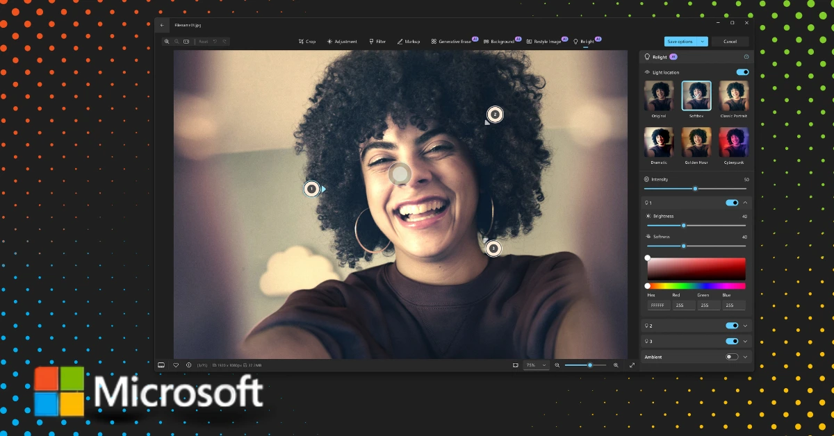 تعتبر ميزة Relight الجديدة في تطبيق الصور من مايكروسوفت أداة قوية تُمكن المستخدم من تعديل الإضاءة بطريقة بصرية فعالة. فمن خلال هذه الميزة، أصبح بالإمكان إضافة ما يصل إلى ثلاث مصادر إضاءة وتحديد مواقعها بدقة، مما يتيح تحكمًا مرنًا في توزيع الإضاءة داخل الصورة.