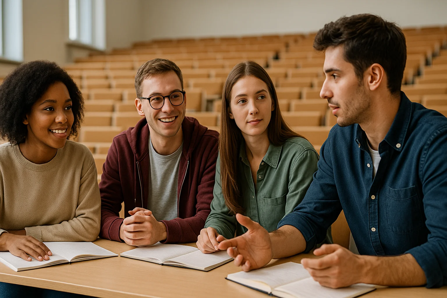 طلاب جامعيون في قاعة محاضرات يناقشون كيفية اختيار تخصص جامعي يواكب متطلبات سوق العمل المستقبلي