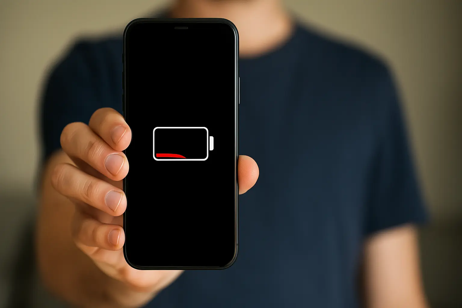شخص يمسك بهاتف ذكي مع عرض نسبة البطارية المنخفضة للتعبير عن أخطاء تستهلك بطارية هاتفك