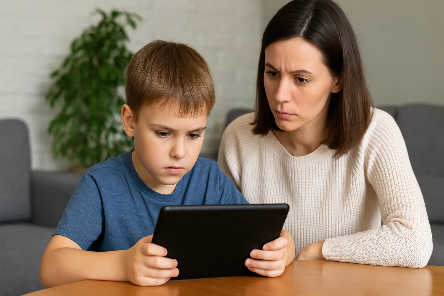 طفل يستخدم جهازًا لوحيًا بينما يراقبه أحد الوالدين لتجنب أخطاء الأطفال على الإنترنت وحمايتهم من المخاطر الرقمية