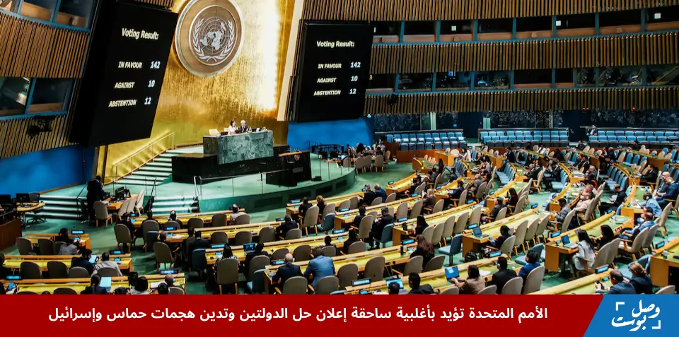 صوّتت الجمعية العامة للأمم المتحدة بأغلبية ساحقة لصالح إعلان يدعو إلى اتخاذ خطوات ملموسة ومرتبطة بجدول زمني لا رجعة فيه نحو حل الدولتين بين إسرائيل وفلسطين. وقد حظي القرار بتأييد 142 دولة، مقابل معارضة 10 دول فقط وامتناع 12 عن التصويت. ويأتي التصويت قبل اجتماع قادة العالم في 22 سبتمبر على هامش الجمعية العامة، حيث من المتوقع أن تعلن عدة دول اعترافها الرسمي بدولة فلسطين.