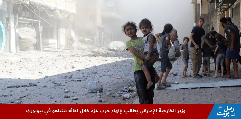 أطفال فلسطينيون يقفون وسط الدمار بعد غارة إسرائيلية في غزة بينما يدعو وزير الخارجية الإماراتي إلى إنهاء حرب غزة خلال لقائه نتنياهو في نيويورك