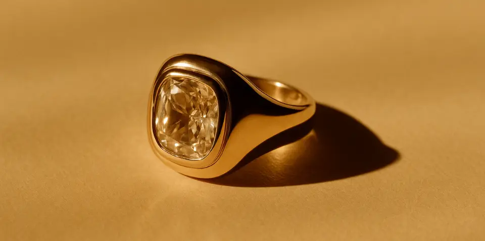 خاتم ذهبي فاخر بتصميم أنيق مع حجر شفاف، يرمز إلى جائزة الخاتم الذهبي التي تمنحها منصة إنستغرام لصانعي المحتوى المبدعين.