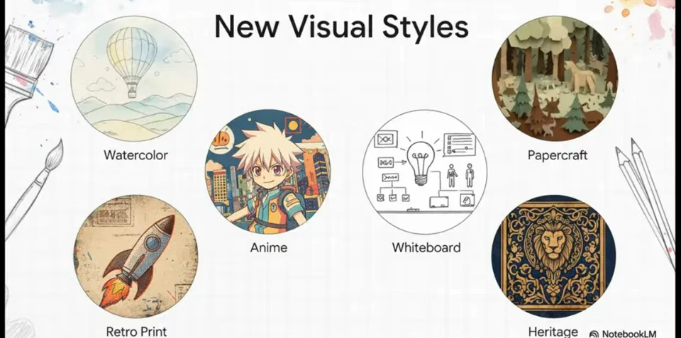 تولد تقنية Nano Banana صورًا توضيحية جميلة وذات صلة بالمحتوى الذي يتم تحميله، مما يجعل الفيديوهات التقديمية ليست مجرد عرض للنصوص، بل أداة تساعد على الفهم والتذكر بشكل أفضل. ويوفر التحديث ستة أنماط بصرية جديدة؛ تشمل: